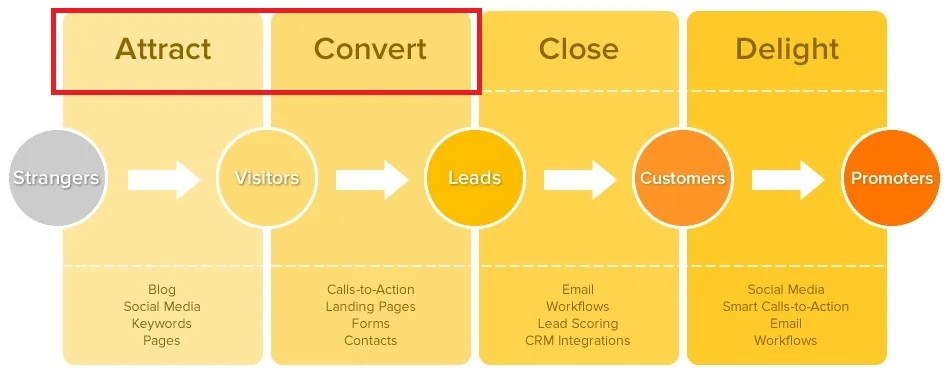 Nella fase Attract, l’obiettivo è quello di attirare gli utenti verso il nostro sito web, utilizzando un blog, i social media e le giuste parole chiave, per trasformare poi quest’utente da estraneo a visitatore.